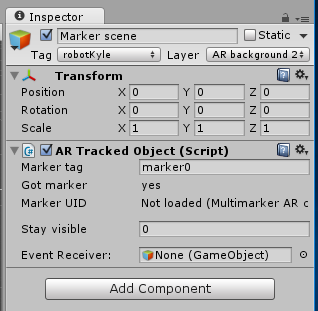 an animation is attached but empty and not active. i removed the attaced animation but no difference... first image is the marker, second the gameObject attached to the marker. (marker is the parent)